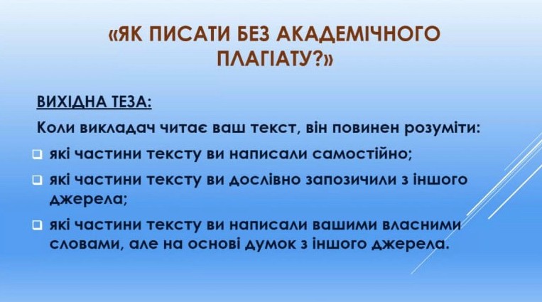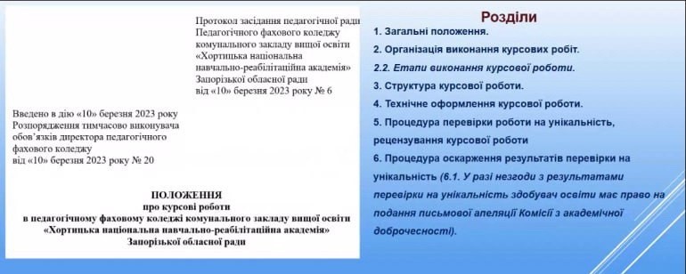 01 грудня 2025 року на виховній годині випускних курсів педагогічного фахового коледжу Хортицької національної академії було проведено зустріч із членами групи сприяння академічній доброчесності. Мельник Ірина Миколаївна нагадала здобувачам освіти про поняття “академічна доброчесність” та дала поради, як під час написання курсової роботи уникати порушення норм академічної доброчесності, зокрема як запобігти плагіату. Здобувачі освіти ознайомилися із правилами цитування та перефразування, згадали вимоги до оформлення курсової роботи, що прописані у чинному нормативному документі закладу “Положення про курсові роботи”. Викладач звернула увагу і на особливості використання штучного інтелекту: дала перелік можливих для використання сервісів та розказала про способи їх використання в межах академічної доброчесності.