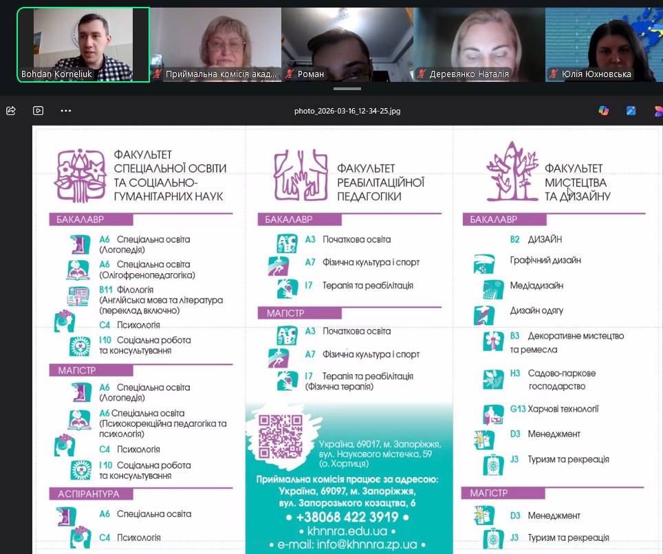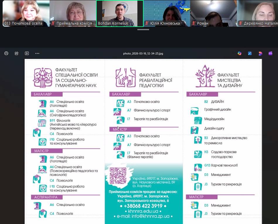 Для здобувачів освіти випускних груп Педагогічного фахового коледжу спеціальності 013 «Початкова освіта»16.03.2026 року було проведено змістовну профорієнтаційну онлайн-зустріч із представниками факультету мистецтва та дизайну Комунального закладу вищої освіти «Хортицька національна навчально-реабілітаційна академія» Запорізької обласної ради.