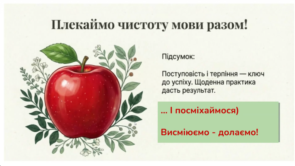 Упродовж години викладачі-філологи Лапіна А.О., Гужва О.І., Газюкіна І.Л. не тільки нагадали теоретичний матеріал, а й ознайомили колег із правильними формами слововживання, синтаксичного керування, збагатили лексику.