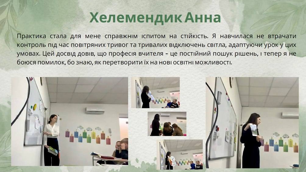 Під час практики студенти спеціальностей 012 Дошкільна освіта, 013 Початкова освіта, 014.12 Середня освіта (Образотворче мистецтво) мали змогу застосувати набуті теоретичні знання в реальних умовах освітнього середовища, продемонструвати професійні компетентності, творчий підхід до організації освітнього процесу, уміння взаємодіяти з дітьми, батьками та колегами. Майбутні педагоги проводили заняття, організовували виховні заходи, здійснювали психолого-педагогічні спостереження, брали активну участь у житті закладів освіти.