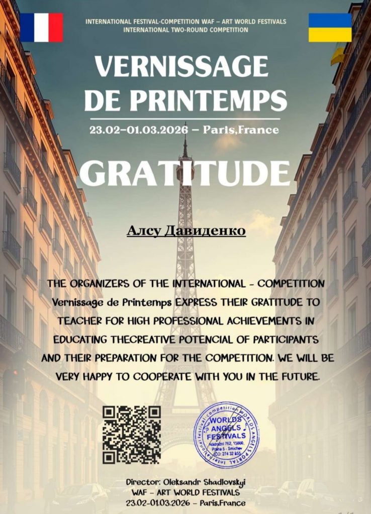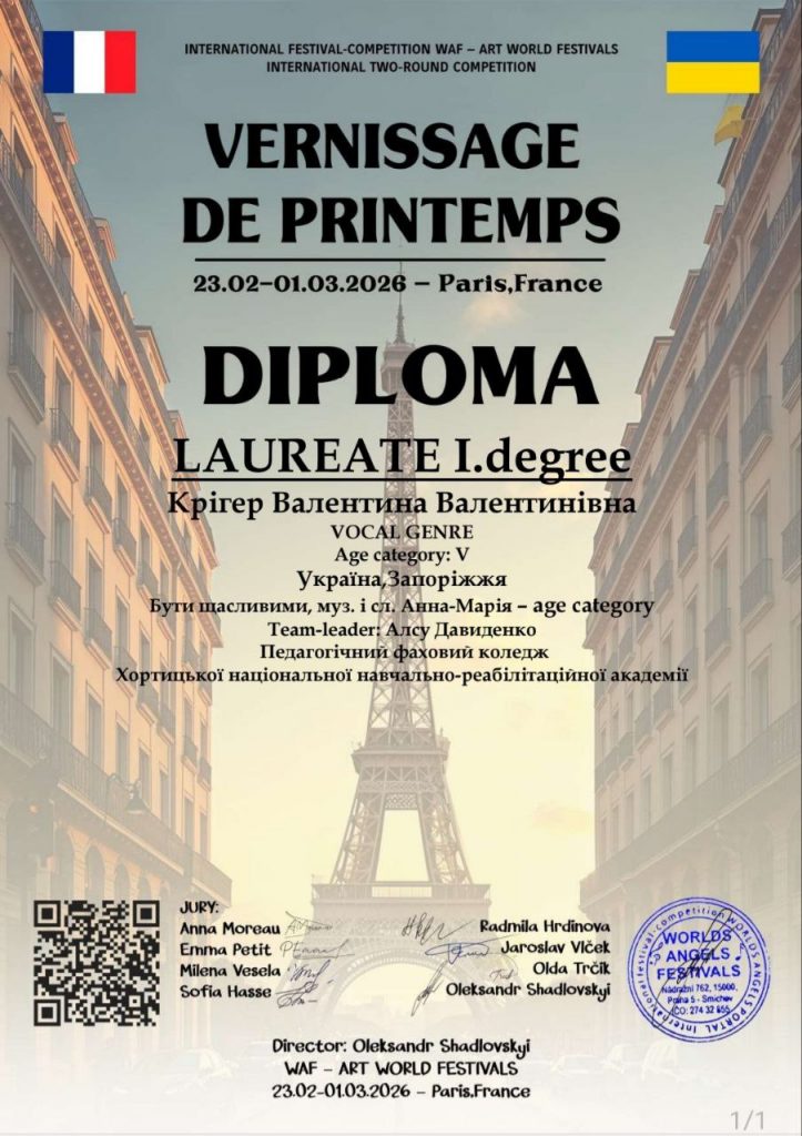 Щиро вітаємо солістку вокально-естрадної студії «Ритм» Валентину Крігер зі званням Лауреата 1 ступеня в Міжнародному двотуровому конкурсі мистецтв Vernissage de Printemps «Весняний вернісаж» (Україна-Париж, Франція), номінація «Естрадний вокал»! Дякуємо наставниці, викладачу педагогічного фахового коледжу, Алсу Казбеківні Давиденко за підготовку виступу Валентини! Бажаємо подальших успіхів, нових звершень та натхнення! Так тримати!